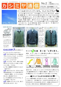 j-comでは、製品の最新情報やカシミヤ豆知識など、いろいろな情報を掲載した「カシミヤ通信」を、月に一度のペースで不定期発行しています。